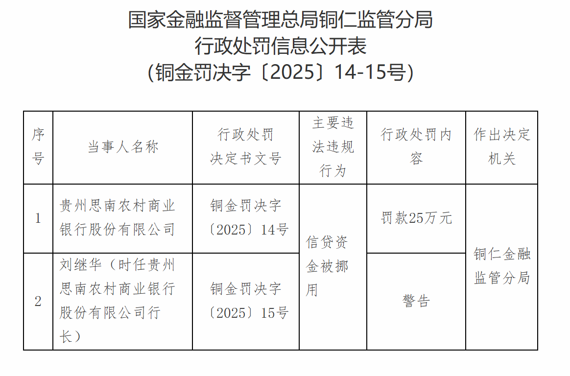 12月11日太原股票开户去哪里,国家金融监督管理总局铜仁监管分局行政处罚信息公开表显示,贵州思南农村商业银行股份有限公司因信贷资金被挪用被罚款25万元;刘某华被警告。