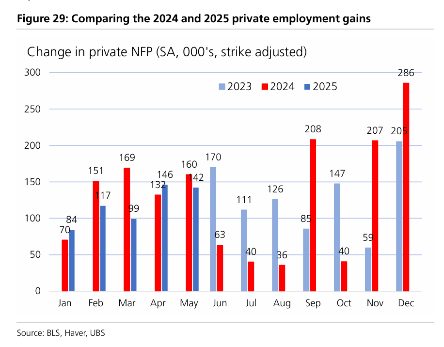 花旗银行也强调了招聘活动的显著放缓。预计夏季招聘疲软对季节性调整构成实质性阻力,因为私人部门就业通常在6月增加约80万个岗位。